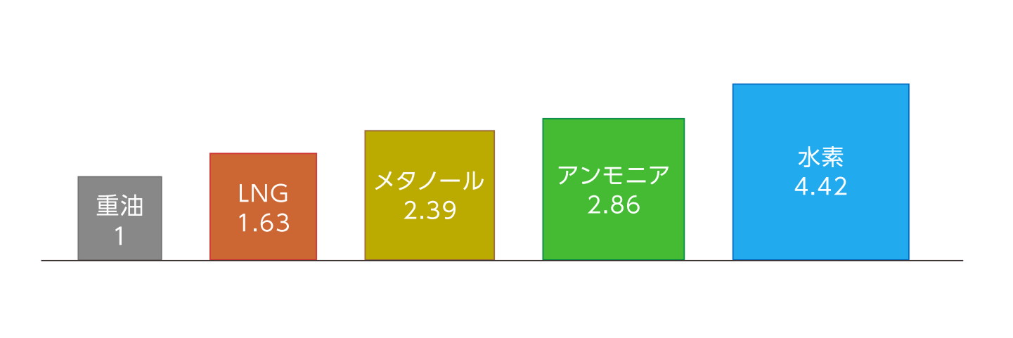 2.棒グラフは、重油を1とした場合の体積比を示しており、「相対的なタンク容量の大きさ)」を比較したもの。[高さと横幅が大きくなるほど、同じエネルギーを得るために必要な体積(燃料タンク)が大きいことを意味している:液化水素は、重油の4.42倍の燃料タンクが必要]。