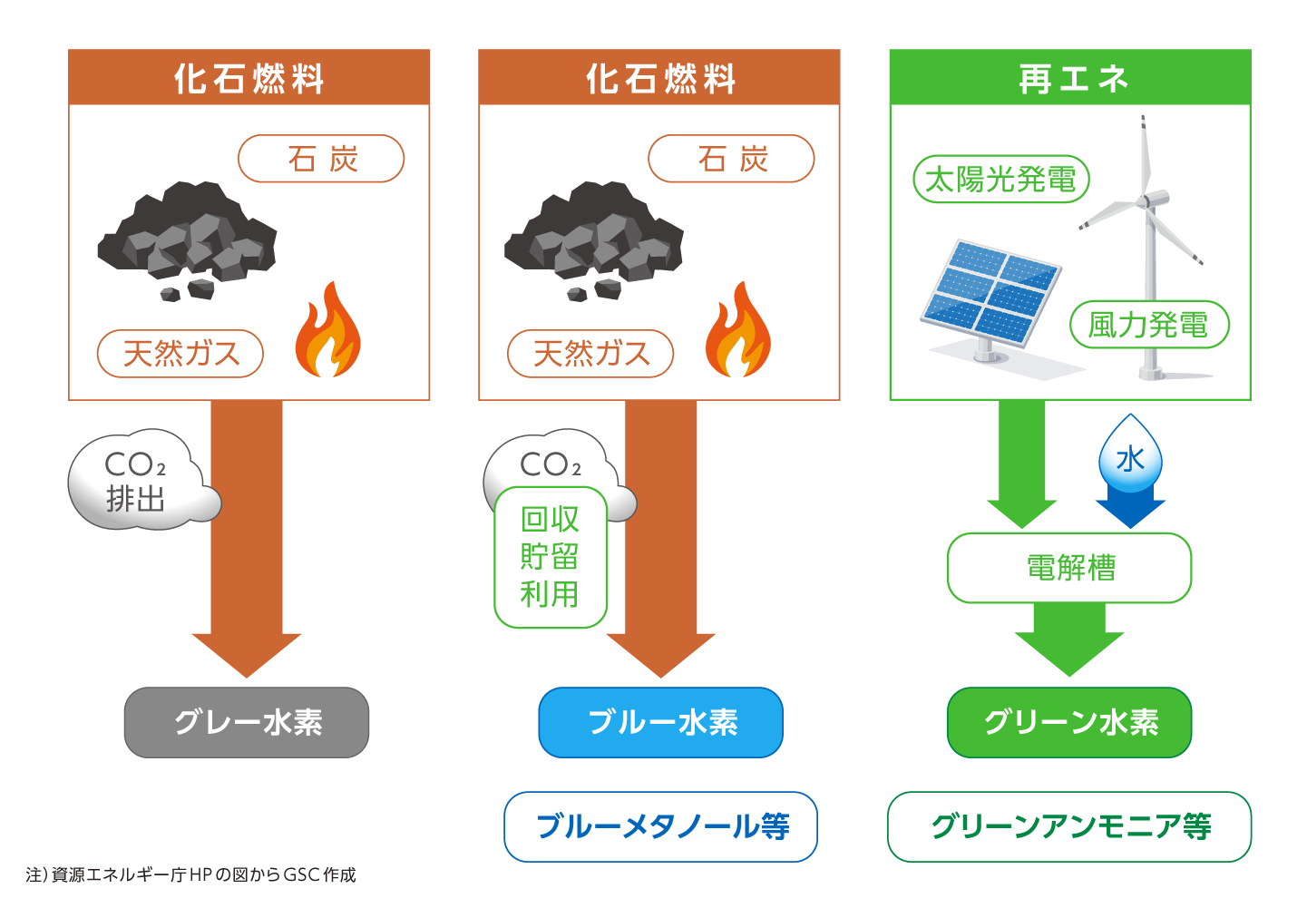 代替燃料及び原料水素の色分け(生成プロセスの違い)