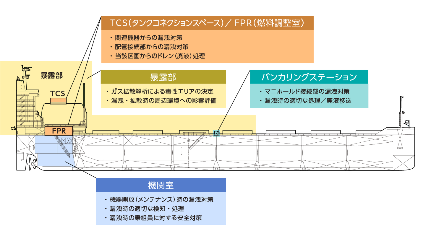 従来の油焚きディーゼルエンジンベースから、新たな燃料の特性に合わせた安全設計・配置設計の再構築