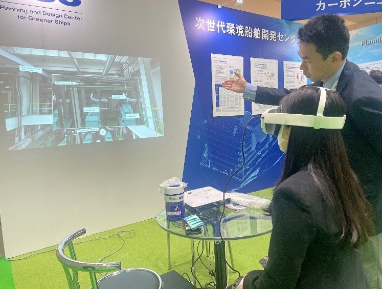 2日目の4月23日(木)には、AI起業家として有名な株式会社シナモンAIのCEO平野未来氏がGSCブースに立ち寄られました。平野氏は高市総理主催の日本成長戦略会議の委員として造船、AI等に関して多くの提言をなされています。その観点から造船ブースを中心にSEA JAPANを視察された中でGSCブースにもお立ち寄りいただき、アンモニア燃料船の機関室VRデモンストレーションもご体験いただきました。