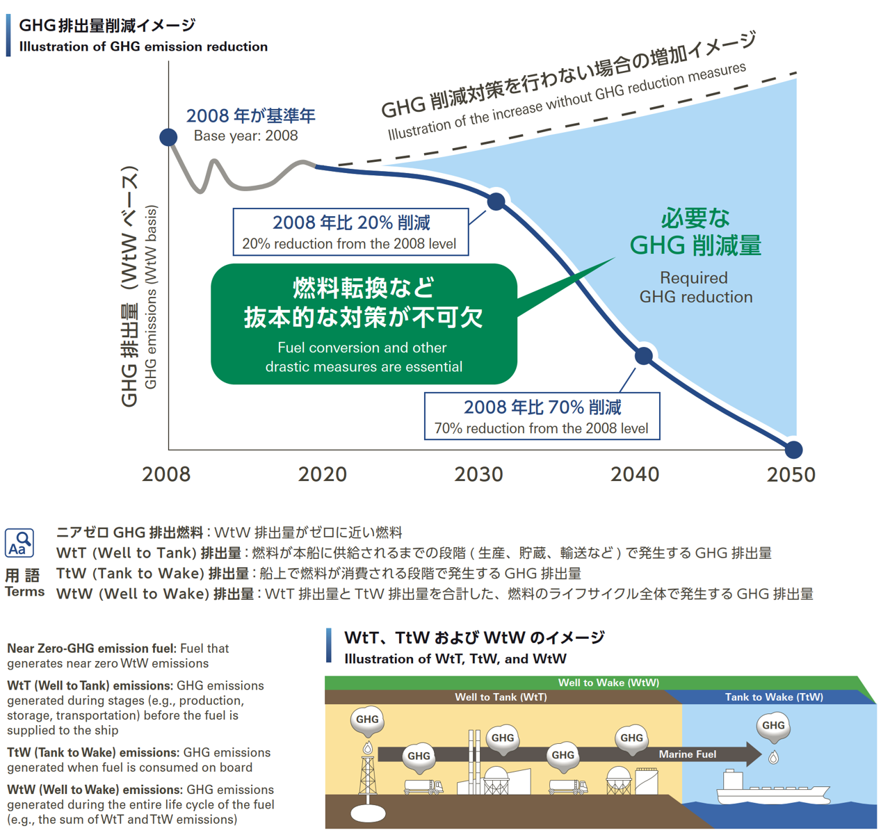 2050 年頃のネットゼロ目標を実現するためには、下図のようにGHG排出を急速かつ大幅に削減することが必要で、ニアゼロGHG排出燃料への転換が求められています。