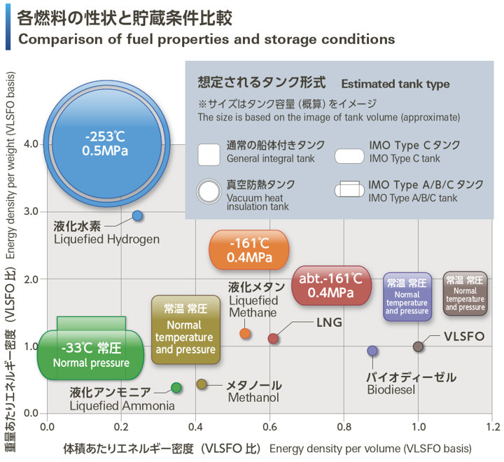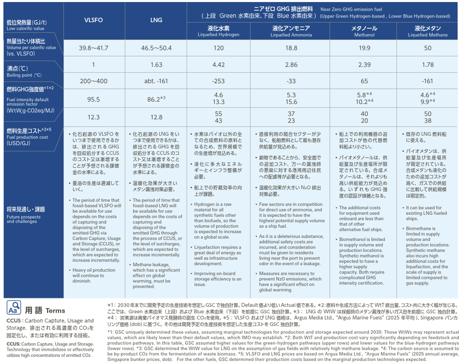 ニアゼロ GHG 排出燃料としては水素、アンモニア、合成燃料など様々な燃料がありますが、船舶においては燃料タンクの体積や船上での取り扱いの容易性などを考慮して船種や航路に応じた最適な燃料を選択していくことが重要です。