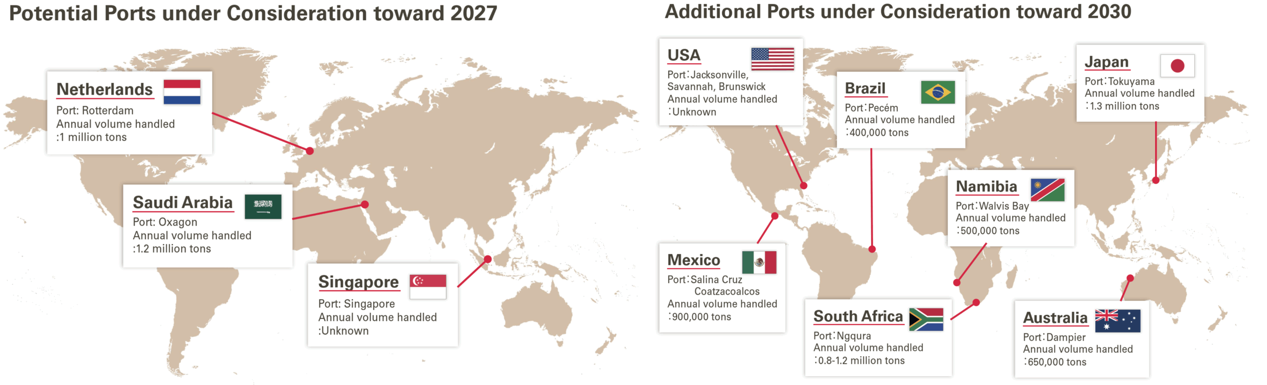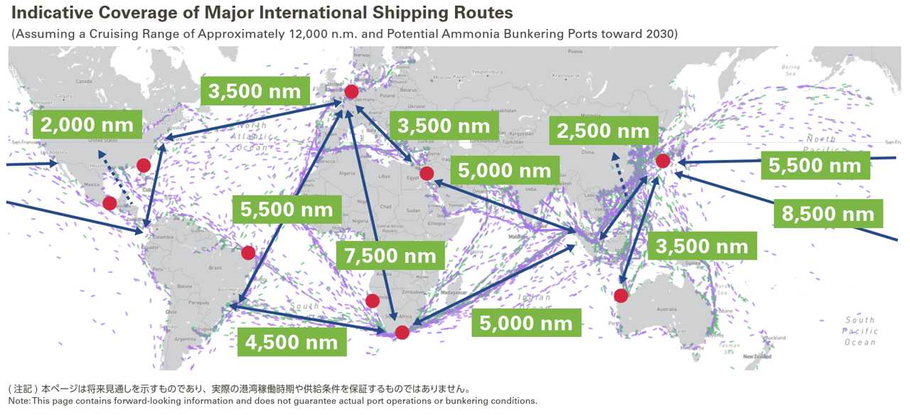 約12,000海里の航続距離を持つアンモニア燃料船を想定した場合、2030年頃に向けてバンカリング可能な港湾が拡大することで、主要な国際航路において、計画的な燃料補給を行いながら運航ができる環境が整いつつあります。