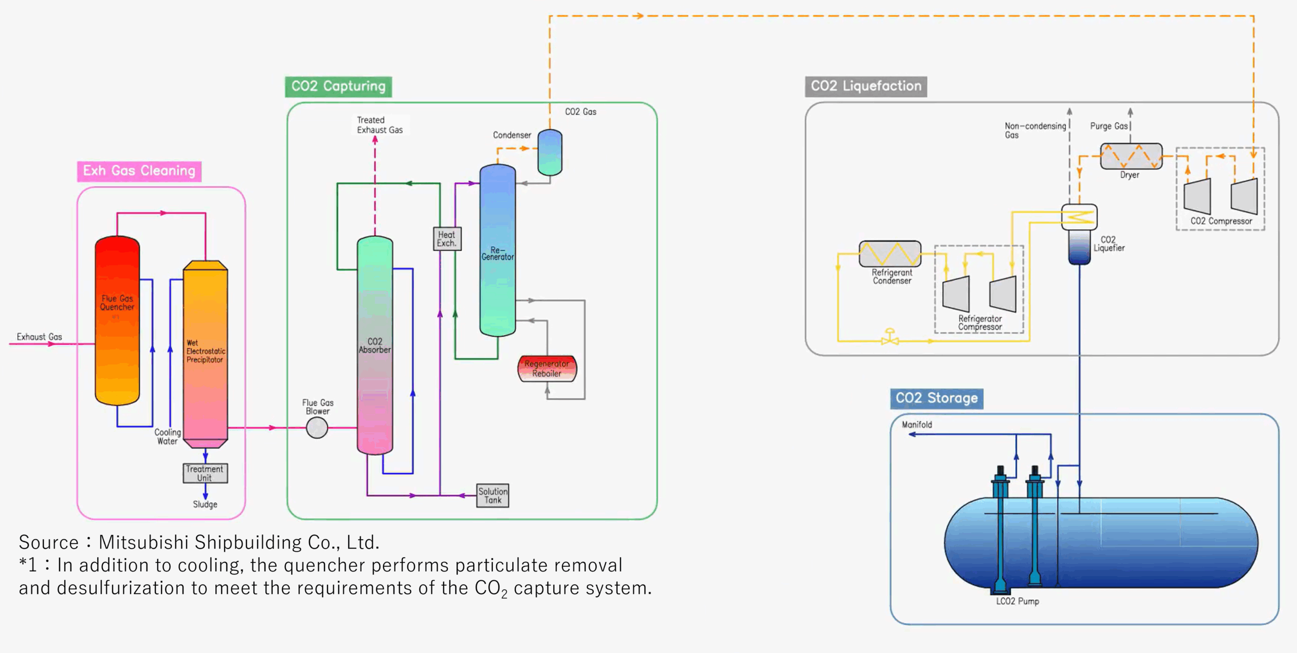 システム構成は、アミン吸収法により排ガス中のCO2を分離・回収、船上で液化、一時貯留。