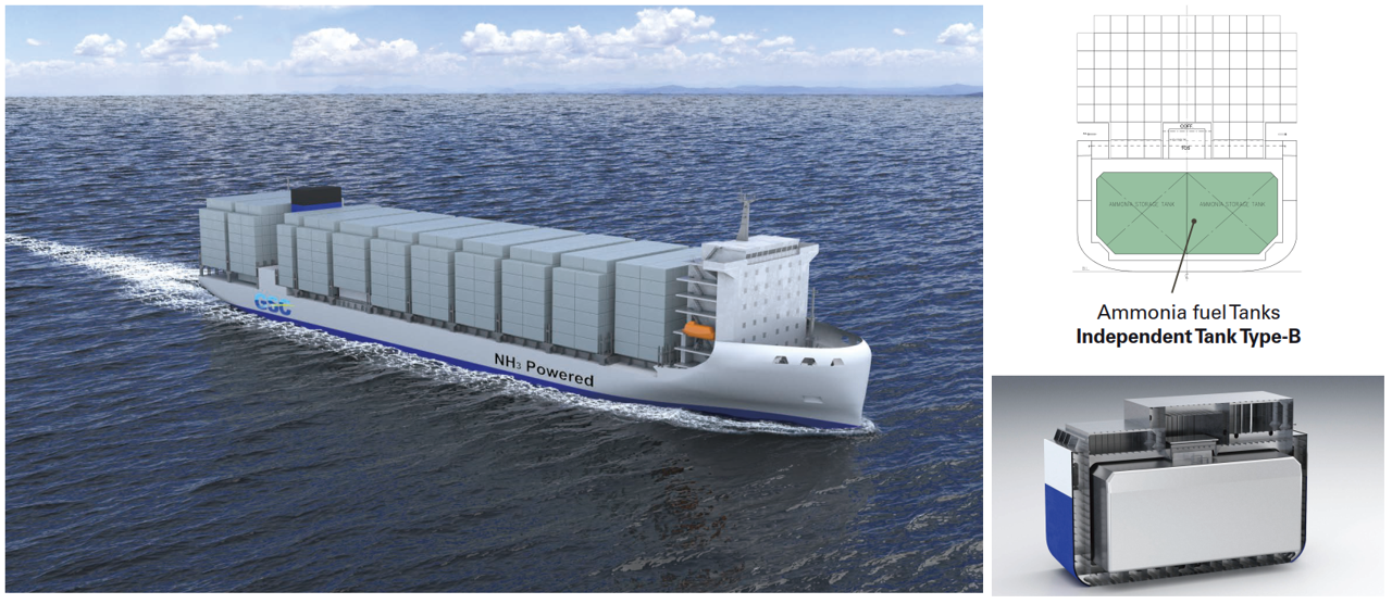 GSCでは居住区を船首部に配置し安全性と効率性に配慮したアンモニア二元燃料コンテナ船のコンセプト設計を実施しました。