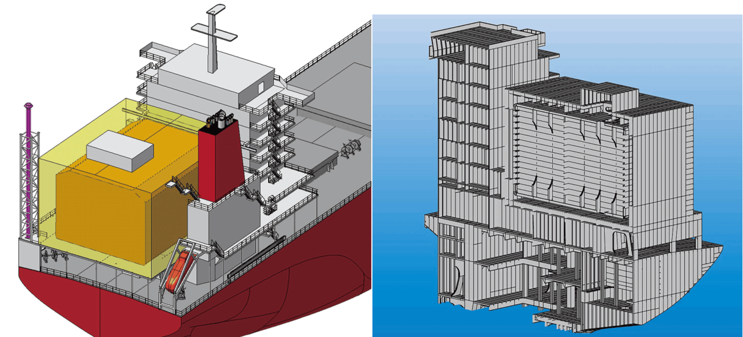 また、方形Type-Bタンクは、暴露甲板に配置するアンモニア燃料タンクとして一般的な円筒形Type-Cタンクに比べて容積効率が優れているほか、Type-Cタンクと異なり専用のタンク製造設備を必要としません。
